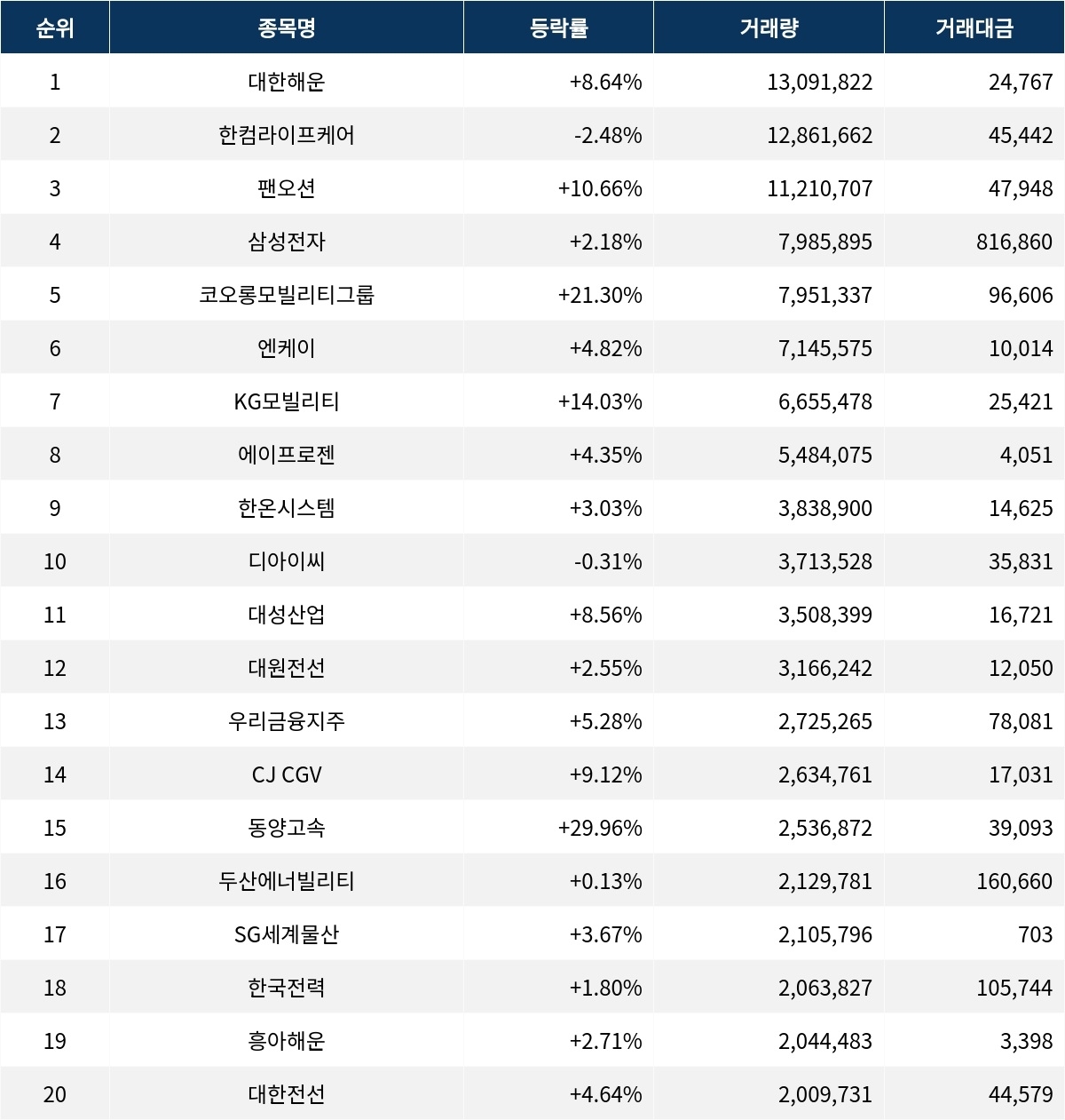 한편 거래량 상위 20위권 종목들은 대성산업(128820) ▲8.56%, 대원전선(006340) ▲2.55%, 우리금융지주(316140) ▲5.28%, CJ CGV(079160) ▲9.12%, 동양고속(084670) ▲29.96%, 두산에너빌리티(034020) ▲0.13%, SG세계물산(004060) ▲3.67%, 한국전력(015760) ▲1.80%, 흥아해운(003280) ▲2.71%, 대한전선(001440) ▲4.64% 등의 성적을 기록했다.