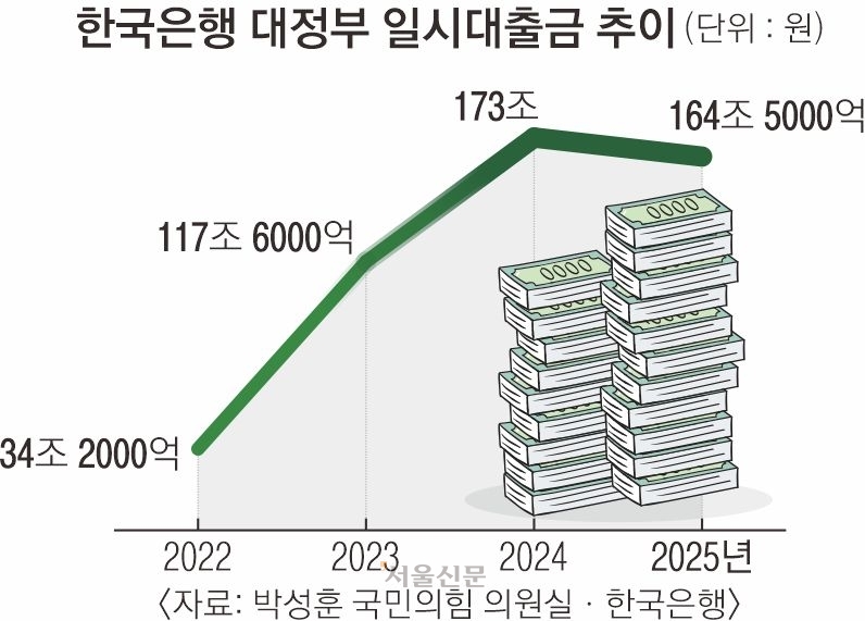 7일 한은이 박성훈 국민의힘 의원실에 제출한 자료에 따르면 정부는 지난달 한은에서 5조원을 일시 차입했다. 지난해 9월 14조원을 차입한 뒤 석 달 만인 12월 다시 돈을 빌린 것이다.